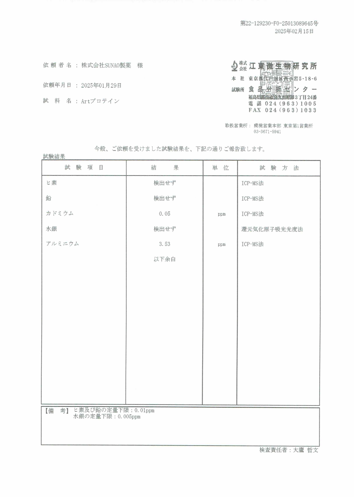 市販の植物性プロテインに安全基準を上回る重金属が検出されるケースが多発していますが、Artプロテインは有害ミネラル検査により、全ての項目で安全基準をクリアしています。